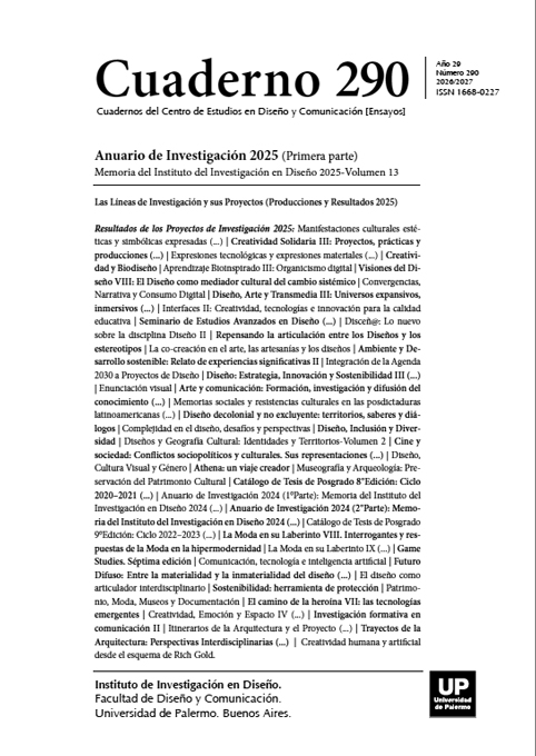 El Proyecto de Investigación 16.22 Anuario de Investigación 2024 (1°Parte) Memoria del Instituto del Investigación en Diseño 2024-Volumen 11 (Cuaderno 290) contiene la primera parte del Anuario de Investigación 2024, es el décimo primer volumen de la Memoria del Instituto de Investigación en Diseño de la Universidad de Palermo. Incluye los Resultados de los Proyectos de Investigación concluidos en el año 2024 además de un conjunto de documentos anexos producidos por el Instituto de Investigación en Diseño.