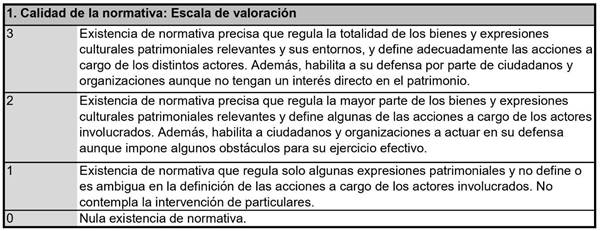 Tabla 2. Ejemplo de las escalas de valoración, Indicador 1. Calidad de la normativa
