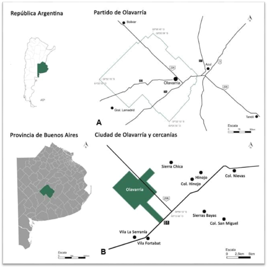 El área de estudio definida para este trabajo fue la ciudad de Olavarría (Provincia de Buenos Aires, Argentina), cabecera del partido homónimo (Figura 1). El partido posee –según el Instituto Nacional de Estadística y Censos- 125.751 habitantes (INDEC, 2022) y la ciudad se considera intermedia menor (Di Nucci y Linares, 2016). La gestión pública local del partido está a cargo del Departamento Ejecutivo Municipal (DEM), representado por un intendente electo cada cuatro años y su gabinete, y un Concejo Deliberante integrado por 20 concejales electos alternadamente, a cuyo cargo está la sanción de las ordenanzas. De 2015 a 2023 fue gobernado por Ezequiel Galli, quién fue precedido por el grupo político encabezado por Helios Eseverri (1991-2007) y, posteriormente, por José Eseverri (2007-2015) (Cantar, 2021a). Cabe mencionar, que en términos de gestión patrimonial los municipios de la provincia de Buenos Aires, al no ser autónomos, tienen sus competencias cercenadas por la normativa provincial. Sin embargo, eso no les impide que, por otras vías, se les reconozcan ciertas competencias sobre algunos componentes del patrimonio cultural (ver Endere e Iturburu, 2010).