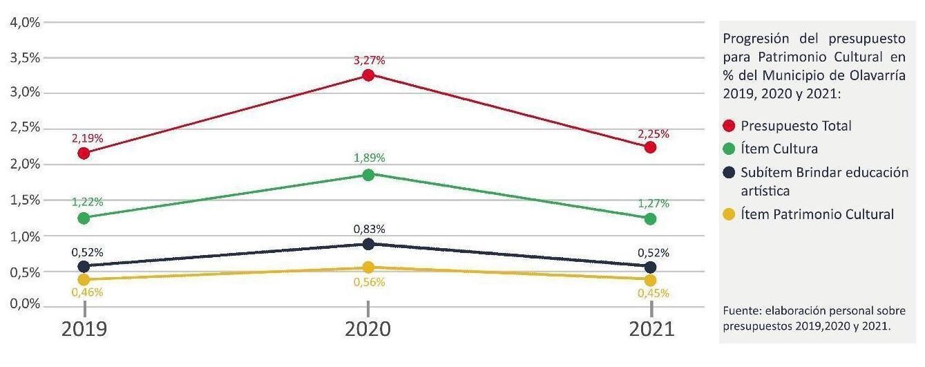 Para el análisis del presupuesto público asignado a la gestión del patrimonio urbano se tomaron como referencia la Rendición de Cuentas 2019 (Municipalidad de Olavarría, Proyecto de Ordenanza Expediente 2020-000052-140284), el Presupuesto General 2020 (Municipalidad de Olavarría, Proyecto de Ordenanza Expediente 2019-000436-138258) y el Proyecto de Presupuesto 2021 (Municipalidad de Olavarría. Proyecto de Ordenanza, Presupuesto General de Gastos 2021, Expediente 2287/20). En tales documentos se analizaron los ítems “Cultura”14 y “Patrimonio Cultural”15, por corresponder a partidas vinculadas al patrimonio cultural. También se analizó el sub-ítem “Brindar educación artística integral (escuelas municipales de artes y oficios)”. Por su parte, no se consideró la asignación presupuestaria al “Ecoparque La Máxima” porque los objetivos del programa no corresponden a la gestión del patrimonio cultural sino a programas de protección animal.