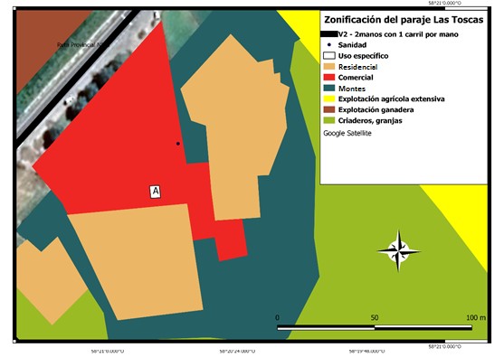 Conocer la morfología y las actividades económicas de Las Toscas, así como sus servicios y equipamientos, permitió realizar una zonificación del área de interés. Las cartografías resultantes se elaboraron sobre la base de la observación directa realizada, y desde la aplicación de la guía para la identificación de estructuras agrarias y otros usos en áreas rurales de Jiménez (Sin Datos), la Guía Metodológica para Estudios de Planeamiento Urbano (2000) - en su sección de usos rurales - y el ID Rural (2013). Se adjunta una cartografía general (Figura 4) y dos cartografías de mayor escala (Figura 5 y 6) que tienen por objetivo brindar mayor nivel de detalle sobre los usos del suelo desde un efecto zoom.