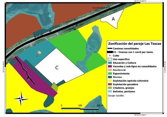 Por último, en base a las mencionadas técnicas, así como a la información obtenida de fuentes de datos secundarias: Censo de Población, Viviendas y Hogares 2010 (INDEC), noticias periodísticas (Ecos Diarios) y documentos familiares recuperados de habitantes del paraje Las Toscas, se elaboró una zonificación para el mencionado lugar en base a los usos del suelo, cartografiando los resultados por medio del software libre QGIS 3.4.13 Madeira. Las cartografías exhibidas poseen el Sistemas de Coordenadas de Referencia WGS 84, con código EPSG: 4326. Las bases de datos geográficos que corresponden a los departamentos de la provincia de Buenos Aires, y a los radios censales establecidos por el INDEC en 2010, fueron extraídos del portal IDERA. Por otro lado, se llevó a cabo la creación de datos geográficos a través de distintas capas vectoriales de puntos, líneas y polígonos.