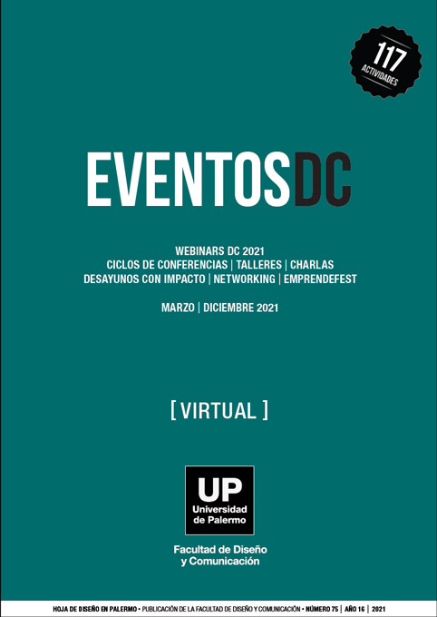 Núm. 75 (2021)Eventos DC es el conjunto de talleres, seminarios y conferencias libres, gratuitas y abiertas a la comunidad, de carácter extracurricular, que brinda la Facultad de Diseño y Comunicación de la Universidad de Palermo. Esta publicación recopila todas las actividades realizadas en el año 2021.