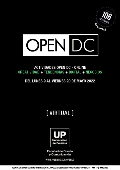 Núm. 78 (2022)Open DC es el conjunto de talleres, seminarios y conferencias libres, gratuitas y abiertas a la comunidad, de carácter extracurricular, que brinda la Facultad de Diseño y Comunicación de la Universidad de Palermo. Esta publicación recopila todas las actividades realizadas en el año 2022.