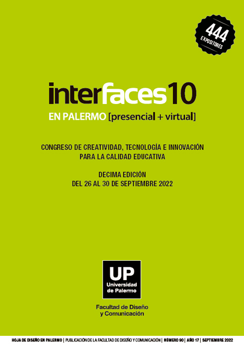 Núm. 90 (2022)Este número recopila, documenta y comunica los resúmenes, con sus autores, de todas las ponencias presentadas en el edición 10 del Congreso Interfaces: Creatividad, Tecnología e Innovación para la Calidad Educativa creado y organizado por la Facultad de Diseño y Comunicación de la Universidad de Palermo en setiembre 2022. El Congreso Interfaces se realiza anualmente, en forma ininterrumpida, desde el año 2014