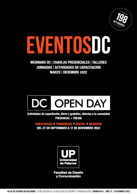 Núm. 91 (2022)Open DC y Eventos DC es el conjunto de talleres, seminarios y conferencias libres, gratuitas y abiertas a la comunidad, de carácter extracurricular, que brinda la Facultad de Diseño y Comunicación de la Universidad de Palermo. Esta publicación recopila todas las actividades realizadas en el año 2022.