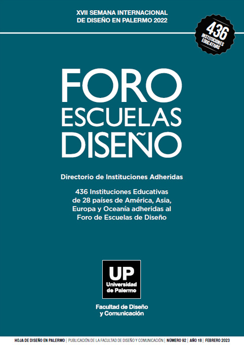 Núm. 92 (2023)El Foro de Escuelas de Diseño es una asociación colaborativa de instituciones educativas vinculadas al campo del diseño. Fue creado y es coordinado por la Facultad de Diseño y Comunicación de la Universidad de Palermo. Actualmente tiene más de 450 instituciones adheridas de América Latina y el mundo. El Foro hace un Plenario anual, en el marco de la Semana Internacional de Diseño en Palermo desde su creación en el año 2007. En esta ocasión fue el Plenario 17 en julio 2022 donde se realizó la primera edición del Simposio Internacional Agenda del Diseño cuyos resúmenes, con referencia a los autores, integran este número.