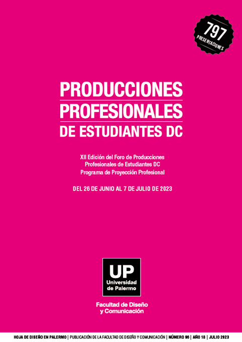 Núm. 96 (2023)Producciones Profesionales de Estudiantes DC es la publicación que reúne las creaciones de los estudiantes avanzados de la Facultad de Diseño y Comunicación de la Universidad de Palermo. Los estudiantes de las asignaturas profesionales de los últimos años de sus carreras integran el Programa Proyección Profesional y presentan sus creaciones en un foro profesional. En este número se recopilan los proyectos presentados por los estudiantes, en el marco de este Programa, en el Ciclo 12, realizado en Julio 2023. Este Programa se realiza cuatrimestralmente, en forma ininterrumpida, desde 2018.