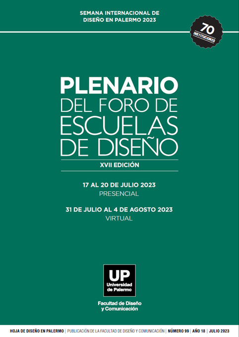 Núm. 99 (2023)El Foro de Escuelas de Diseño es una asociación colaborativa de instituciones educativas vinculadas al campo del diseño. Fue creado y es coordinado por la Facultad de Diseño y Comunicación de la Universidad de Palermo. Actualmente tiene más de 450 instituciones adheridas de América Latina y el mundo. El Foro hace un Plenario anual, en el marco de la Semana Internacional de Diseño en Palermo desde su creación en el año 2007. En esta ocasión fue el Plenario 18 del 17 al 21 de Julio 2023 Presencial - 31 de Julio al 4 de Agosto 2023 Virtual, donde se realizó la primera edición del Simposio Internacional Agenda del Diseño cuyos resúmenes, con referencia a los autores, integran este número.
