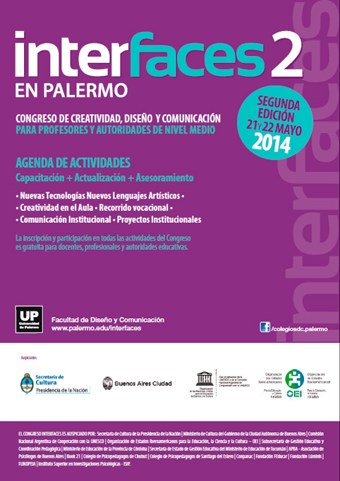 Núm. 18 (2014)Este número recopila, documenta y comunica los resúmenes, con sus autores, de todas las ponencias presentadas en el edición 2 del Congreso Interfaces: Creatividad, Tecnología e Innovación para la Calidad Educativa creado y organizado por la Facultad de Diseño y Comunicación de la Universidad de Palermo en Mayo 2017. El Congreso Interfaces se realiza anualmente, en forma ininterrumpida, desde el año 2014