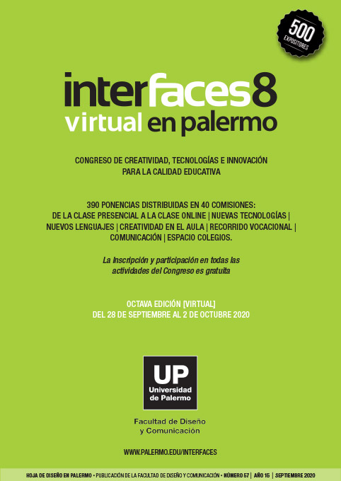 Este número recopila, documenta y comunica los resúmenes, con sus autores, de todas las ponencias presentadas en el edición 8 del Congreso Interfaces: Creatividad, Tecnología e Innovación para la Calidad Educativa creado y organizado por la Facultad de Diseño y Comunicación de la Universidad de Palermo en setiembre 2020.