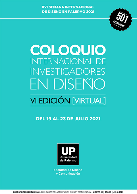 El Coloquio Internacional de Investigadores en Diseño es un evento anual creado y organizado por el Instituto de Investigación en Diseño de la Universidad de Palermo. En este número se recopilan los resúmenes de todas las ponencias, con referencia a sus autores, proyectos y líneas de investigación, que se presentaron en la edición 6 del Coloquio que se realizó en Julio 2021. El Coloquio se realiza anualmente, en forma ininterrumpida desde el año 2016, en el marco de la Semana Internacional de Diseño en Palermo