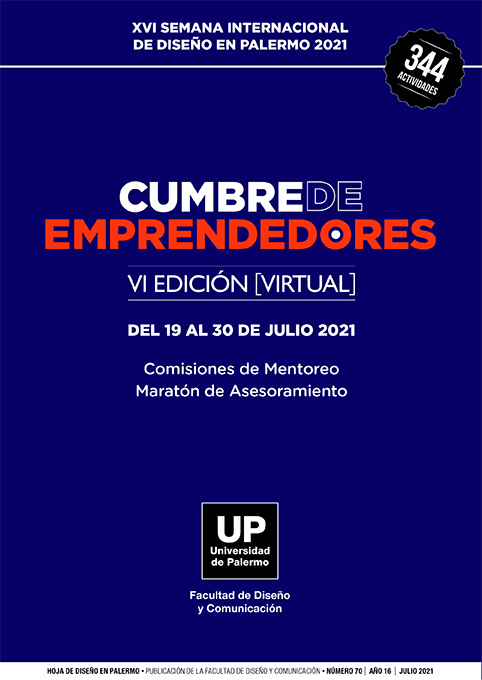 La Cumbre de Emprendedores Creativos reúne un conjunto de actividades destinadas a la capacitación y la vinculación profesional de estudiantes avanzados y jóvenes profesionales y emprendedores de todos los campos del diseño, las comunicaciones y la creatividad de Argentina y América Latina. Es un evento anual creado y organizado por la Facultad de Diseño y Comunicación de la Universidad de Palermo. En este número se reúnen todas las actividades de la Cumbre  correspondiente  la edición 6 ,  julio 2021. La Cumbre se realiza anualmente, en forma ininterrumpida,  desde el año 2016, en el marco de la Semana Internacional de Diseño en Palermo.
