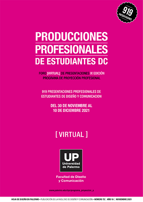 Producciones Profesionales de Estudiantes DC es la publicación que reúne las creaciones de los estudiantes avanzados de la Facultad de Diseño y Comunicación de la Universidad de Palermo. Los estudiantes de las asignaturas profesionales de los últimos años de sus carreras integran el Programa Proyección Profesional y presentan sus creaciones en un foro profesional. En este número se recopilan los proyectos presentados por los estudiantes, en el marco de este Programa, en el Ciclo 9, realizado en Noviembre y Diciembre 2021. Este Programa se realiza cuatrimestralmente, en forma ininterrumpida, desde 2018.