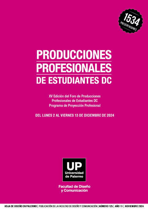 Producciones Profesionales de Estudiantes DC es la publicación que reúne las creaciones de los estudiantes avanzados de la Facultad de Diseño y Comunicación de la Universidad de Palermo. Los estudiantes de las asignaturas profesionales de los últimos años de sus carreras integran el Programa Proyección Profesional y presentan sus creaciones en un foro profesional. En este número se recopilan los proyectos presentados por los estudiantes, en el marco de este Programa, en el Ciclo 15, realizado en Diciembre 2024. Este Programa se realiza cuatrimestralmente, en forma ininterrumpida, desde 2018