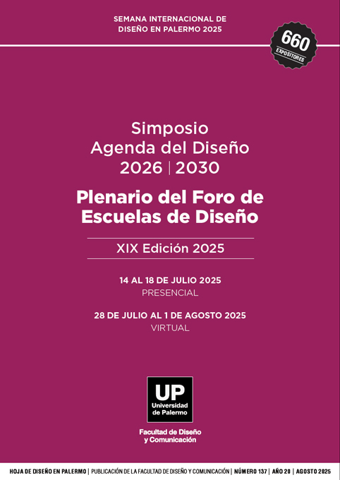 El Foro de Escuelas de Diseño es una asociación colaborativa de instituciones educativas vinculadas al campo del diseño. Fue creado y es coordinado por la Facultad de Diseño y Comunicación de la Universidad de Palermo. Actualmente tiene más de 450 instituciones adheridas de América Latina y el mundo. El Foro hace un Plenario anual, en el marco de la Semana Internacional de Diseño en Palermo desde su creación en el año 2007. En esta ocasión fue el Plenario 19 en julio 2025 donde se realizó la primera edición del Simposio Internacional Agenda del Diseño cuyos resúmenes, con referencia a los autores, integran este número.